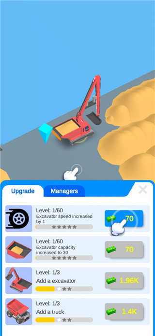 闲置沙地大亨是款卡通画风模拟经营手游,玩家将会经营一家沙场,需要不断的采集沙子满足不同客人的任务获得收益,还需要将沙场不断的进行升级就可以大大提升机器的工作效率。玩家还可以建造新的建筑,而利用这些建筑去赚钱的话,也必然会让你成为真正的商业大亨。