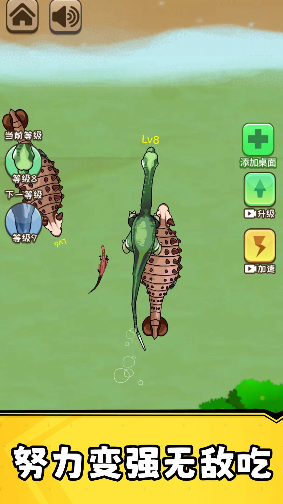 1、开局时,会化身为小恐龙,需要不断吞噬、进化和合成来提升自己;