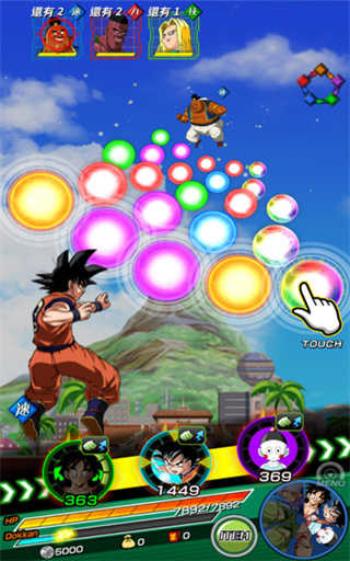战斗方式类似三消的拼图系统,连结一定数量的「气珠」后,就能解锁「Dokkan 模式」,发动魄力无穷的必杀技。更新后,更是新增了「爆裂连锁激战」(Chain Battle)模式,可借助好友的力量,合作击出超高伤害。