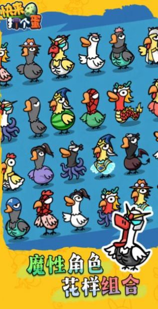 快来打个蛋是一款很好玩的冒险游戏,这里的冒险内容很多,玩家需要在游戏内完成各种冒险任务,组建自己的小队,收集更多的公鸡,充分发挥它们的技能,制定正确的策略来抵挡敌人的进攻,生存的更久,游戏内的怪物种类很多,都是有着不同的属性的赶紧来试试吧。