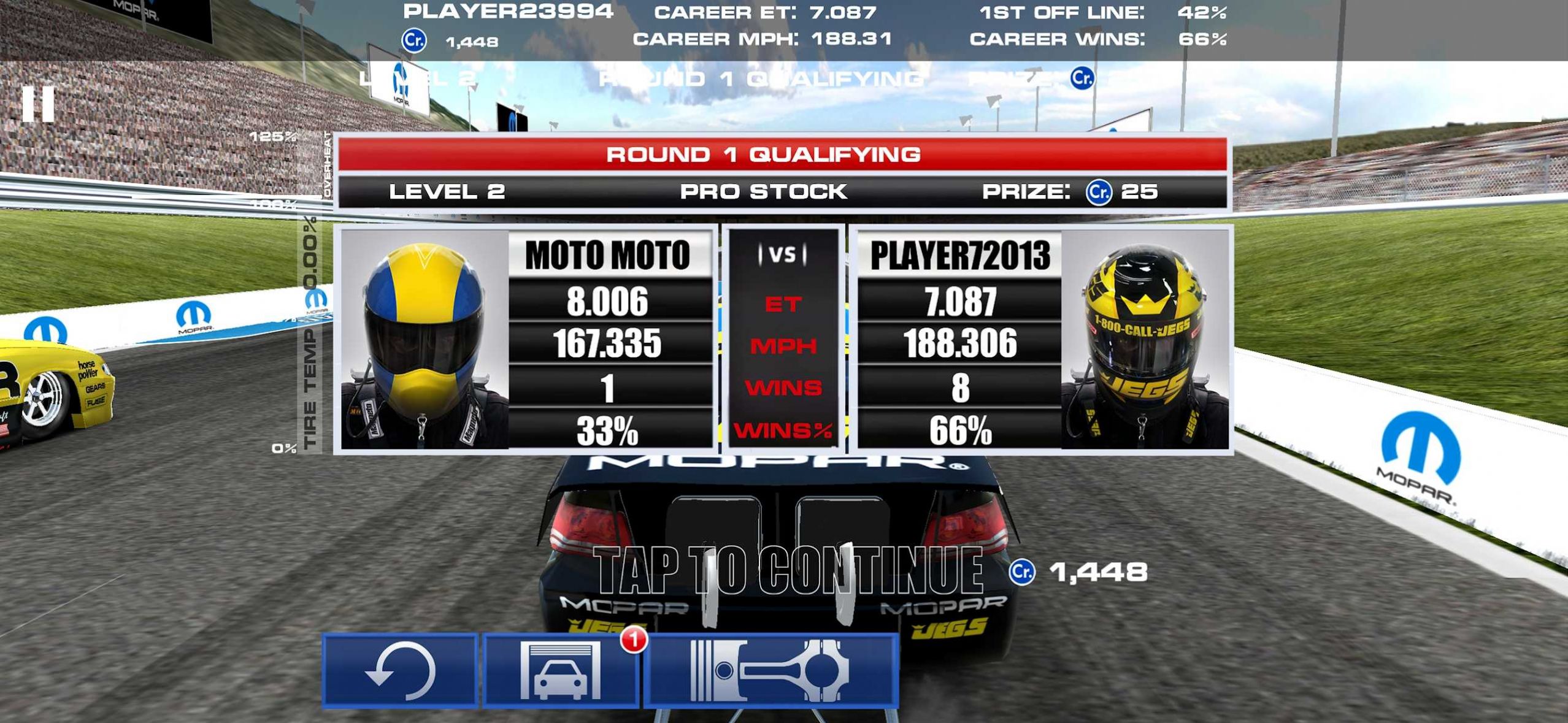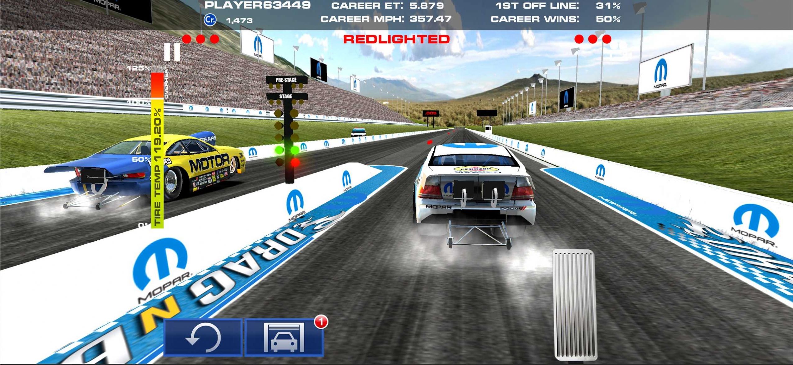 赛前倦怠。在每次通过之前,驾驶员可以进行倦怠,清洁和加热 Mopar 的轮胎,以提高牵引力。观察左侧的温度条,但要小心,油门太大会使轮胎过热并降低抓地力。
