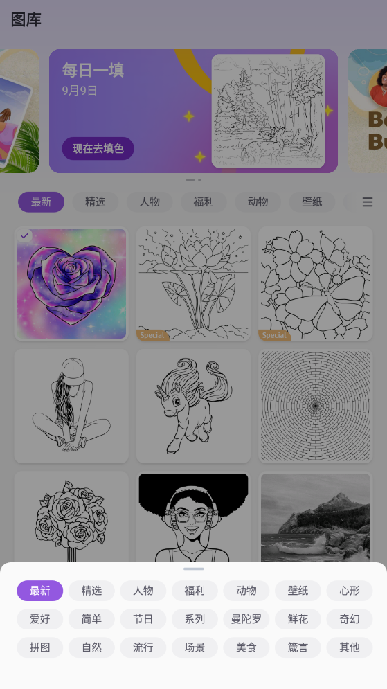 1、图片的种类有很多种。花卉、动物、古代人物、碧苑、可爱卡通、美食、风景等数十个类别供你选择,新版本更有惊喜Hello Kitty主题图!每一天都会带来新的画面和感受。绚丽的色彩、细腻的线条,让你随时一扫压力与焦虑!