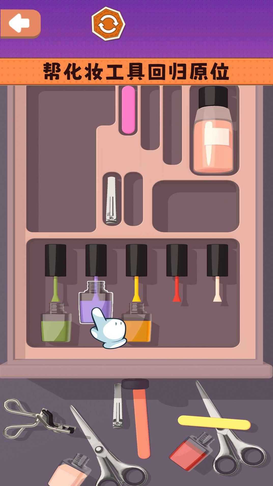 2、在卧室主题中,玩家可以准确地将各种化妆品放入相应的盒子中。