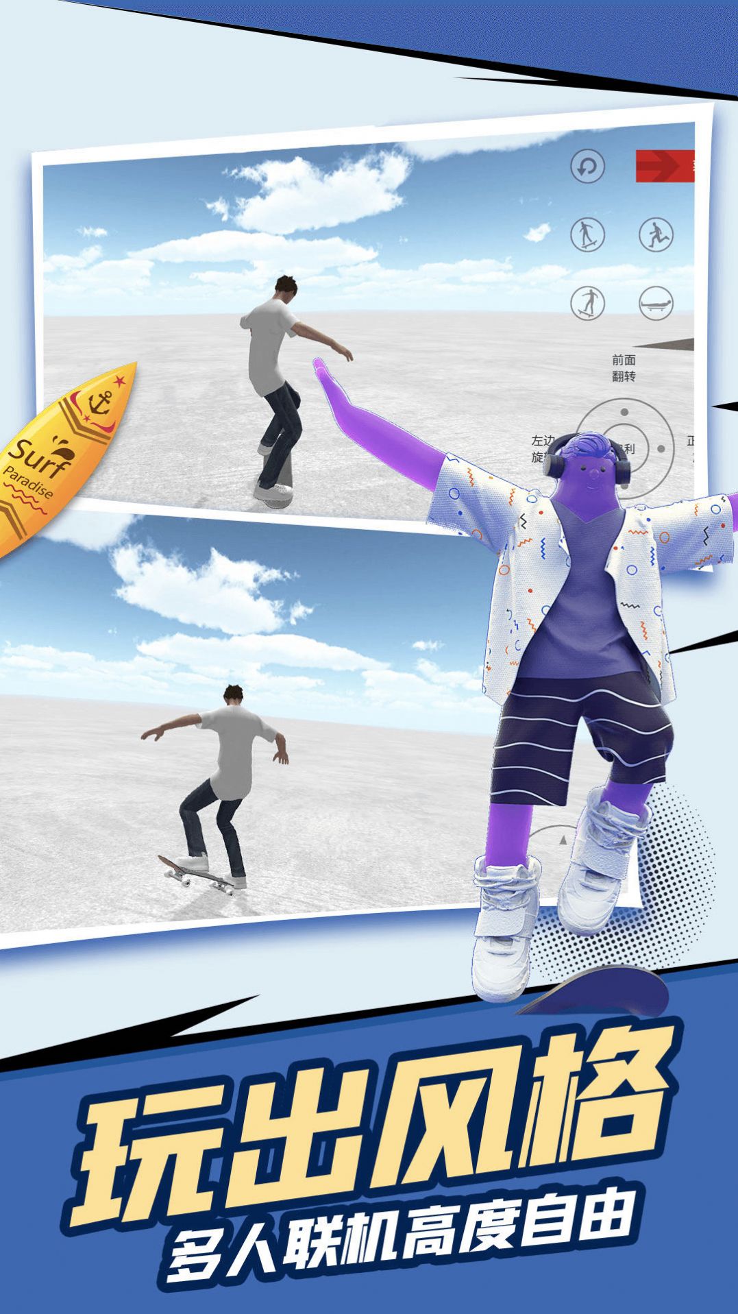 3、在游戏中,可以自定义角色,包括造型、衣着、滑板等;
