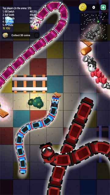 1)无边界地图,玩家可以尽情挑战其他玩家,在竞技场中展现自己的蛇火车控制技巧。