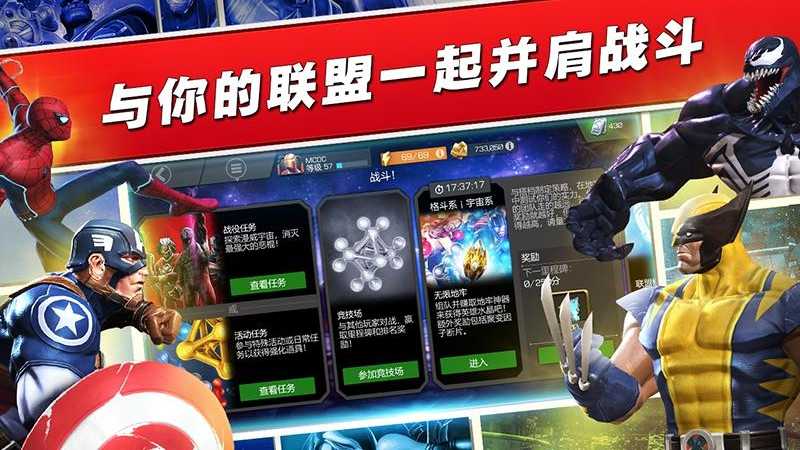 2、用英雄和反派角色来打造一支战无不胜的队伍,击败征服者康和灭霸,接受来自一位全新的神秘超级强力宇宙敌手的挑战,并最终阻止漫威宇宙的大毁灭,使用多种天赋树来强化队伍的进攻和防御能力。