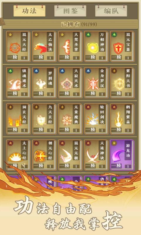 炼丹获得药材,提升属性;通过炼器获得神器,增强实力,布阵合理安排妖怪的阵容,应对各种挑战。