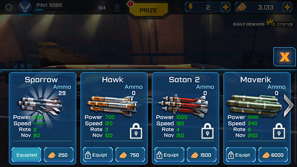 现实攻击和轰炸动画,定制战机画,升级战斗机空速,升级导弹射程;