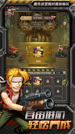 2、阵容属性,灵活变换,从容面对各种敌人!放置玩法,挂机升级,游戏时间由你掌控,不当合金工具人