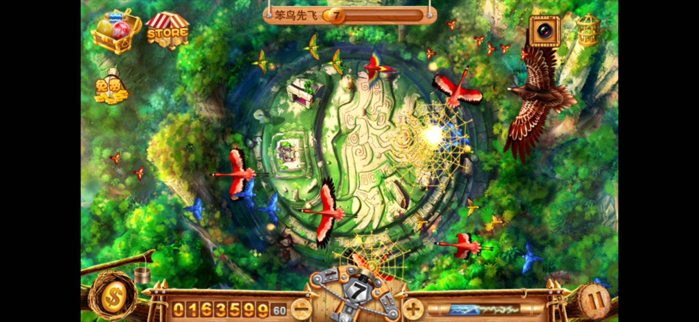 1、点击屏幕发射网,每只捕获的鸟都会转换成金币,金币能够支持你打出更多的网。