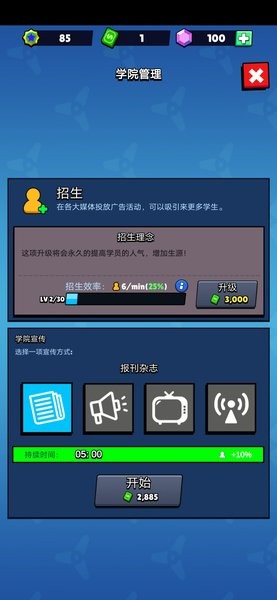 3、招募更多的超能力者,可以获得更多的补助金,并使用金币来扩大你的学院。