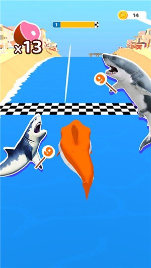 2、玩家需要控制鲨鱼在河里竞速,吃掉奖励和食物来提高速度