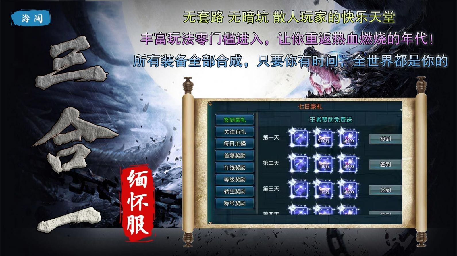 海阔三合一缅怀服是一款很好玩的战斗冒险游戏,玩家可以在游戏内体验到许多经典好玩的内容,丰富的装备都是可以选择的,好的装备帮助玩家可以更快的完成任务,游戏内的画面十分的高清流畅,带来很好的体验,还有各种酷炫的特效,喜欢传奇战斗游戏的玩家赶紧来试试吧。