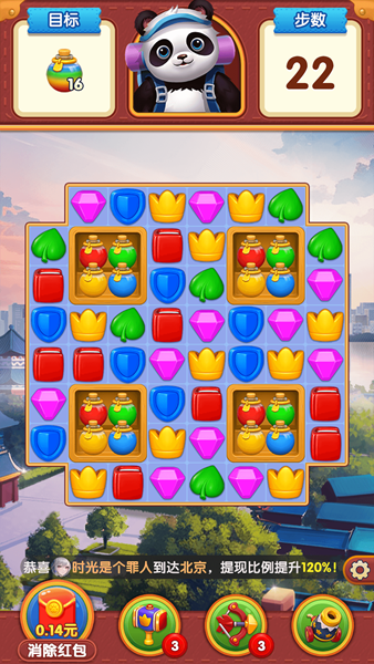 熊猫爱旅行是一款非常好玩的手机趣味消除闯关游戏,这款游戏的画面非常的趣味,在这里你能够扮演一只熊猫,在中国的土地上自由的进行冒险,每个地图上都拥有自己独特的消除关卡,不一样的消除方块设计,让你拥有更加趣味的游戏体验,游戏还拥有非常多样的故事剧情等你体验,现在下载还有机会领红包哦。