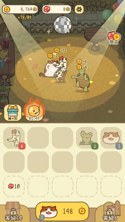 猫猫很可爱,生出来的小猫崽崽也很可爱,鱼干攒的也超快,收集速度合适,游戏整体非常休闲佛系。