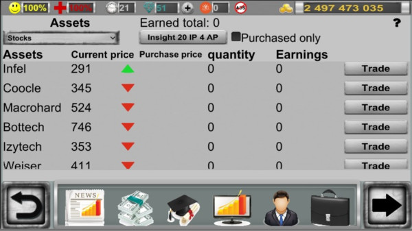 投资模拟器是一款有趣的投资模拟管理游戏,在游戏中提供真实的投资模拟环境,玩家可以在游戏中模拟投资操作,了解并学习到投资的相关知识和技巧,实时行情和新闻资讯,玩家可以及时了解市场动态,做出合理的投资决策,玩家可以通过查询实时行情和新闻资讯来获取市场信息,做出相应的投资决策,体验投资管理的趣味。