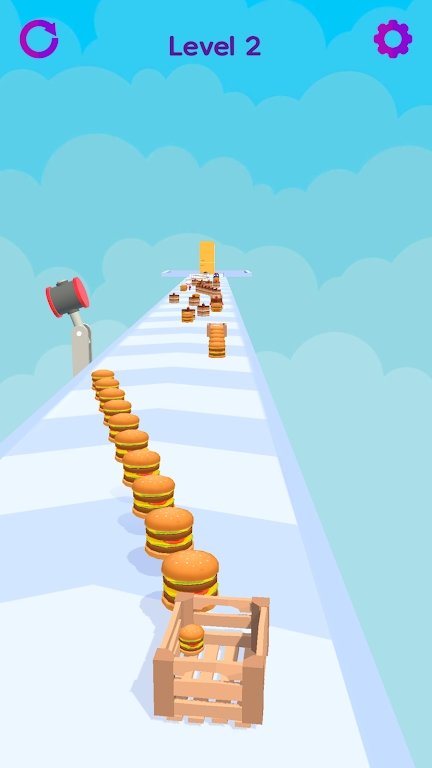2、收集到足够数量的汉堡后,玩家需要将其填充到场景中的木箱中才能完成目标并通过关卡。