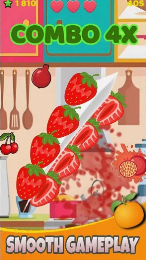 游戏的目标是将屏幕上的不同种类的水果切成块,然后通过将切好的水果块滑动到对应的篮子里来获得分数。
