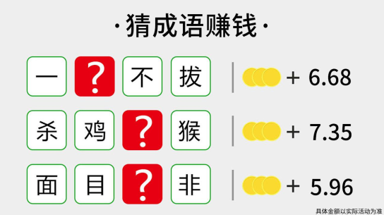 2、成语答题:游戏会出现不同的成语问题,玩家需要根据题目的描述、提示或字谜来猜出正确的成语。答对后可以获得相应的红包奖励。
