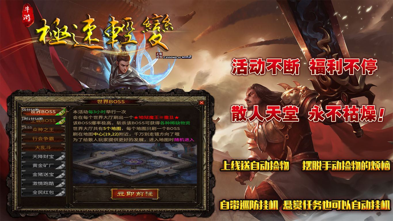 牛游极速轻变是一款传奇战斗游戏,这里的战斗玩法相当丰富,有着许多热血的内容玩家都是可以在这里体验到的,丰富的角色有着不同的属性玩家可以自行的选择,感受不一样的技能,游戏内的模式很多,玩家可以根据自己的喜好来选择,喜欢传奇游戏的玩家赶紧来试试吧。