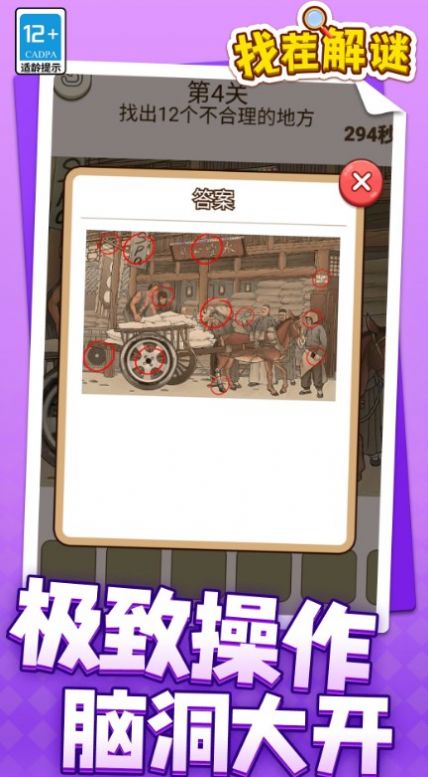 找茬解谜是一款好玩的解谜游戏,这里的解谜玩法很多,都是相当精彩的,这里的关卡内的谜题难度都是不同的,玩家需要仔细的思考来解开各种谜题,游戏内的道具很多,玩家都是可以选择的,不同的道具可以帮助玩家更快的闯关成功,高清的游戏画面赶紧来试试吧。