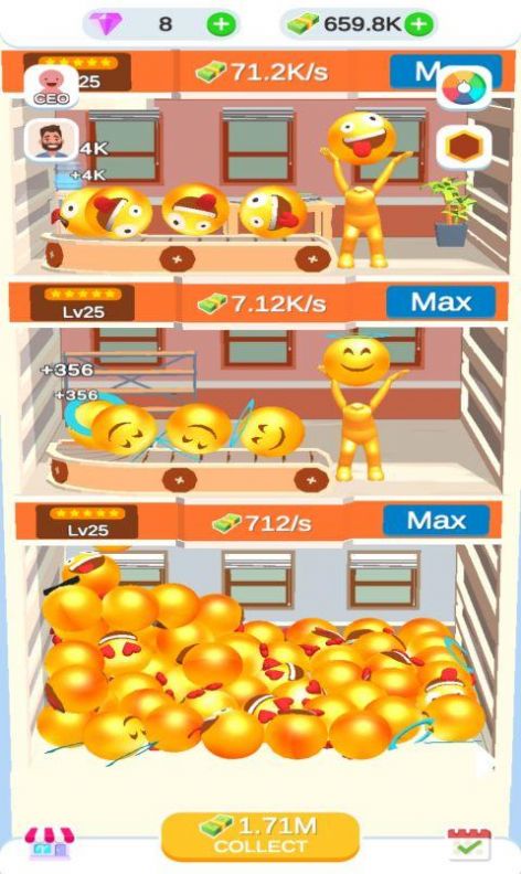 2、在游戏中,玩家将在工厂里购买先进的机器来制作各种不同表情符号进行销售并获得金钱。