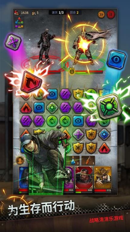 2、玩家需要与幸存者团队合作,运用三消技能,最终击败丧尸领袖,保卫最后的生存希望。