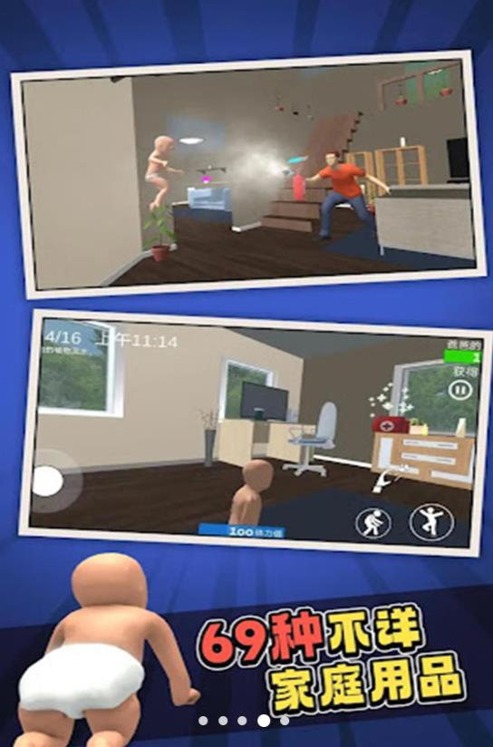 1.卡通的游戏画面拥有童趣和不同的画面,包含了卧室,厨房和客厅等各个场景,还有不同的人物与道具,感受游戏的多样性。