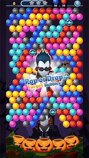 1、通过射击泡泡龙消除相同颜色的泡泡,解锁关卡并获取奖励;