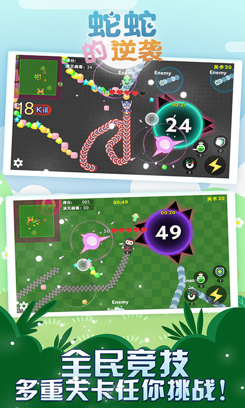 1、蛇蛇的逆袭是一款非常有趣的卡通模拟贪吃蛇的游戏