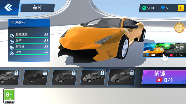 1、在比赛中获得声望点数,解锁新的汽车和道具;