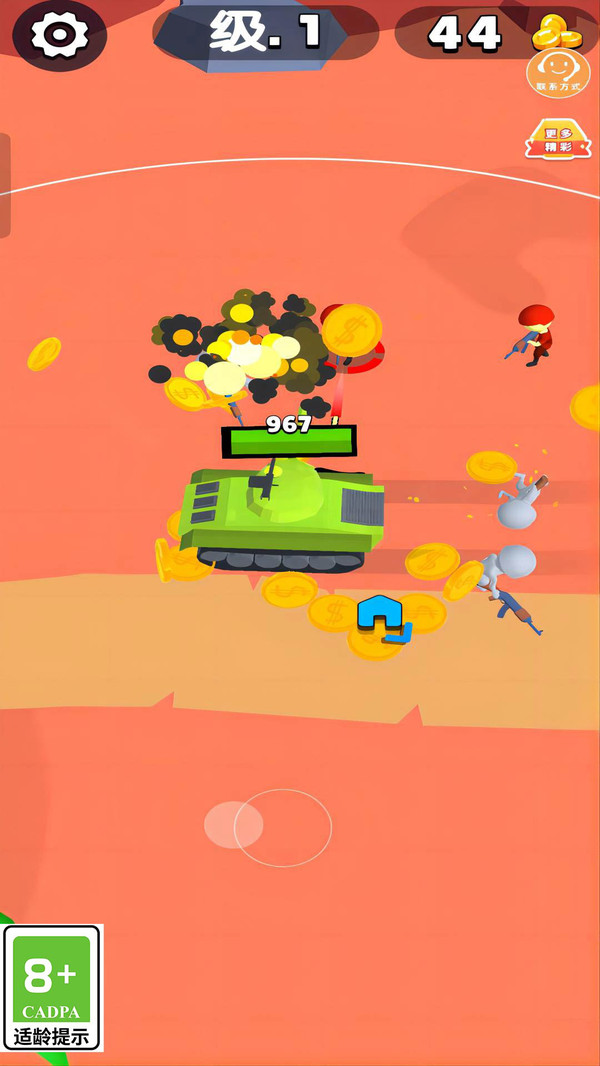 2.超过20种战车类型,4个精致战场,10多种道具,20多种技能以及60多个精心设计的关卡。