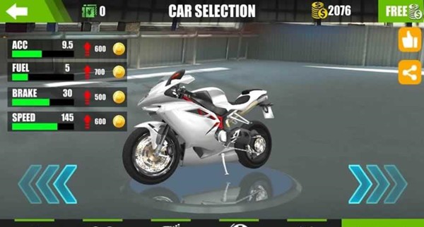 3、玩家可以选择不同类型的摩托车进行自由驾驶,每辆摩托车都有自己独特的特点和性能,