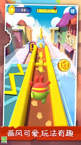 1、玩家控制可爱角色的进程,前进吃金币,碰到怪物时消灭怪物。