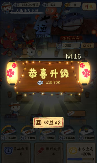 2、快来帮帮可怜的喵太,让它的大渔庭成为第一的料理名店吧!