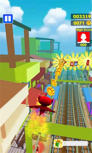 4、道具合理利用:玩家们在游戏中不仅要收集金币,扑面而来的火车也会让你累够呛,在这个过程中你可以使用道具,加速道具能够让你快速前进,使用滑板可以帮助你多出一条生命,点击屏幕两次可以使用道具。