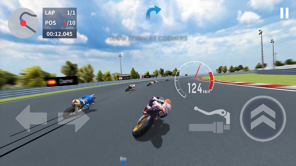 3、通过倾斜设备或虚拟按钮来控制摩托车的转向,猛踩油门来加速冲刺。