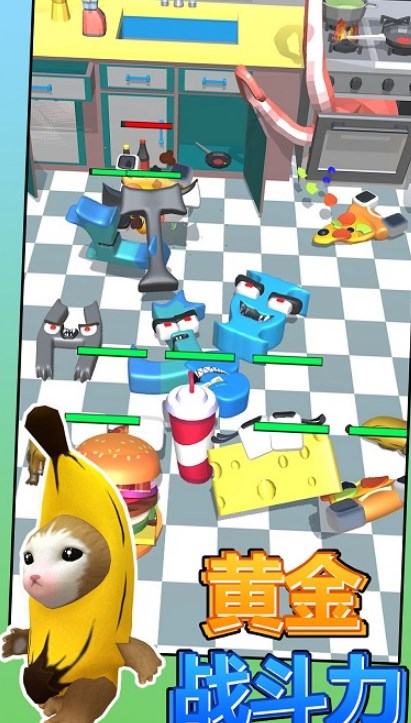 1、玩家会扮演一个拿着巨大剑的香蕉猫,对抗着怪物、敌人的进攻;