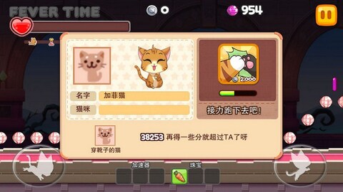 5、猫咪冲冲冲手游与一般的跑酷类游戏对比,较大的亮点是设置了打Boss的故事情节,每一关都是有不一样超自然能力的大Boss,赛事后半期,其总体难度系数较高,使赛事趣味性增长,另外也更具有比赛感。