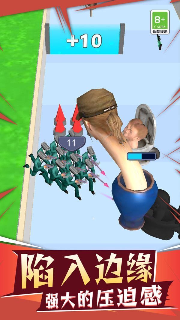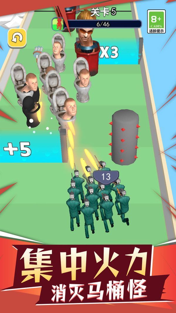监控人大作战是一款非常有趣的手机射击跑酷闯关游戏,在游戏中玩家们要控制你在地图上的军人进行跑酷闯关挑战,在这里你要控制你的士兵拿上武器来消灭地图上的各种马桶人以及监控人,通过跑酷赛道中的机制来让自己的士兵更多,武器装备更加的先进,赶快下载体验吧。