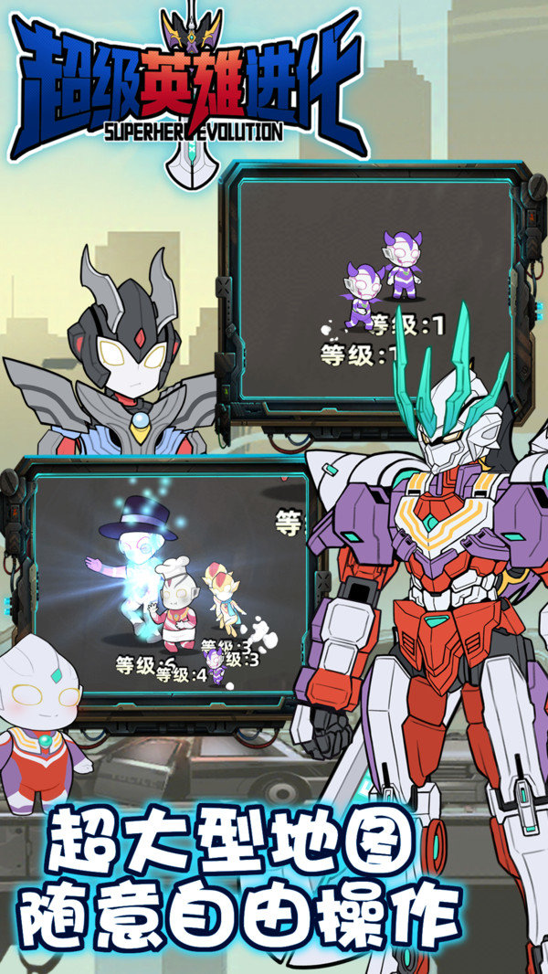 超级英雄进化是一款非常好玩的手机趣味闯关变声战斗题材游戏,这款游戏将奥特曼跟高达融合在了一起,刚开始的时候玩家们要控制非常Q萌的奥特曼进行战斗,经过战斗经验的获取,你的奥特曼战士能够变声成为高达机器人,非常的好玩有趣,赶快下载吧。