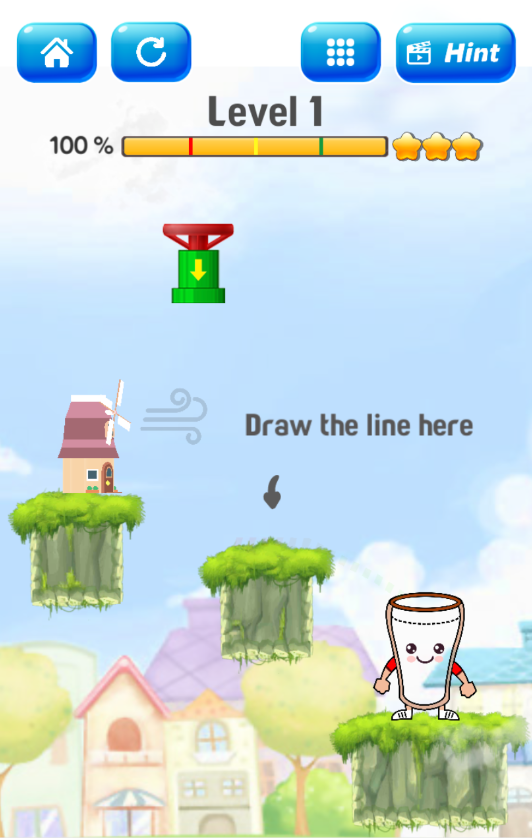 2、利用物理原理画线,引导水流沿着线轨迹顺利流入水杯。将水杯装满即可进入下一关。