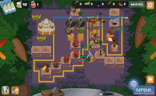 根据地图布局和敌人的位置放置炮塔,利用不同类型的炮塔来进行防御,保护蛋糕不被敌人抢走。