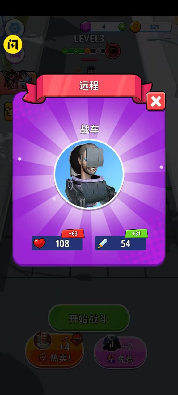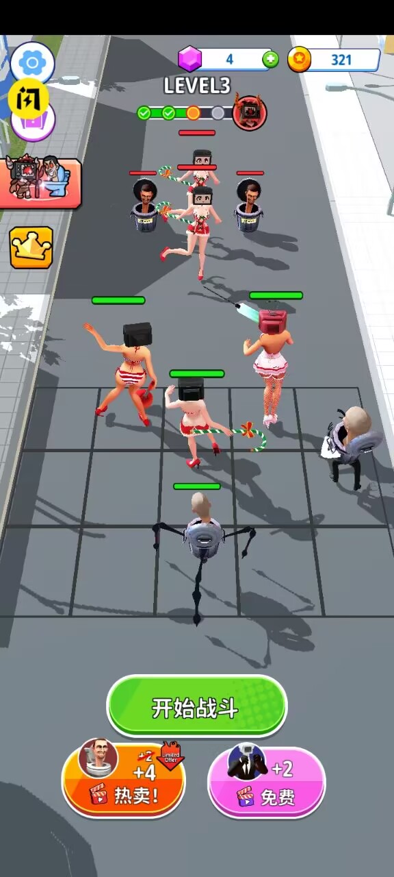 3、合成并展示你的马桶泰坦和电视女神部队,挑战更高难度的关卡!战略性地组合具有共同特点的角色,例如相同护士装的女TV人,以此增强您的阵容。