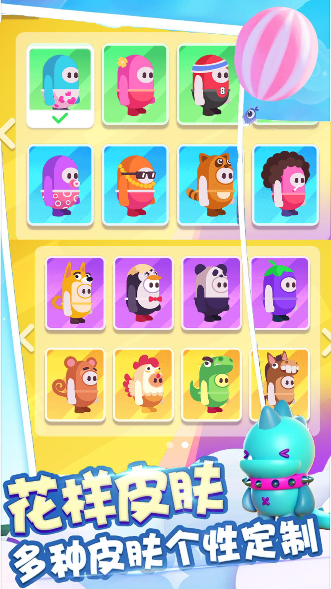2、丰富角色皮肤解锁,装扮糖豆玩关卡,多人竞技比赛,玩家将加入糖豆吃鸡赛道上比拼;