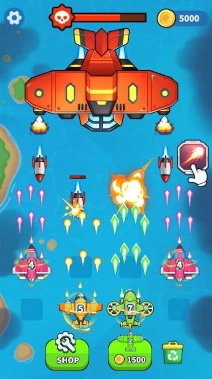 1、超酷的飞行射击游戏,玩家需要通过游戏不断升级和合并飞机,将弱小的飞机转变为强大的战斗机;