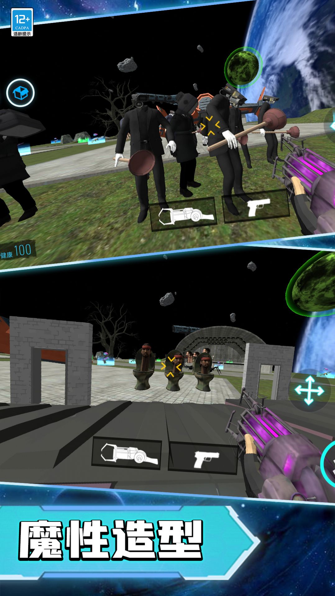 马桶人宇宙大战是一款有着最高清的游戏画面的动作闯关游戏,这款游戏当中我们将会去无限的进行着作战,一定要很好的来保护好我们的宇宙哦,只有这样才能够去保护更多的人群,超级多的武器都等着我们去解锁,一定要把自己的各种游戏目标去很好的完成,才能够去解锁出更多的任务。