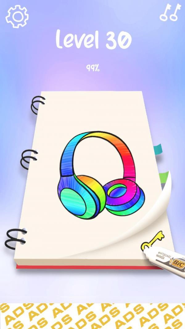 3、上色绘画:玩家可以使用魔法画笔,在线稿的空白部分选择不同的颜色、纹理进行上色,创作出属于自己的绘画作品。