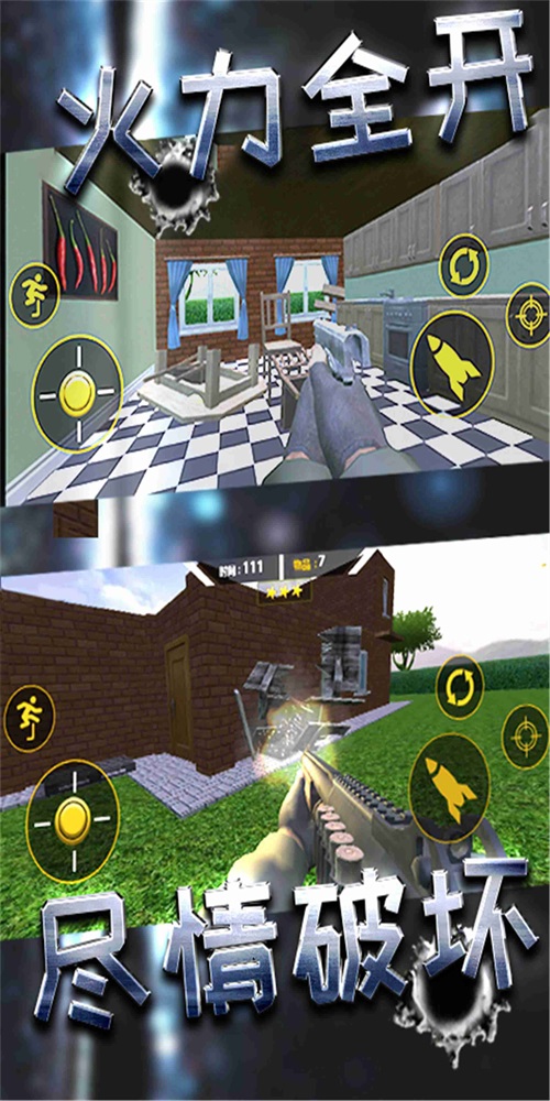 1、游戏内容丰富有趣。使用你的枪来享受摧毁房屋的快感。