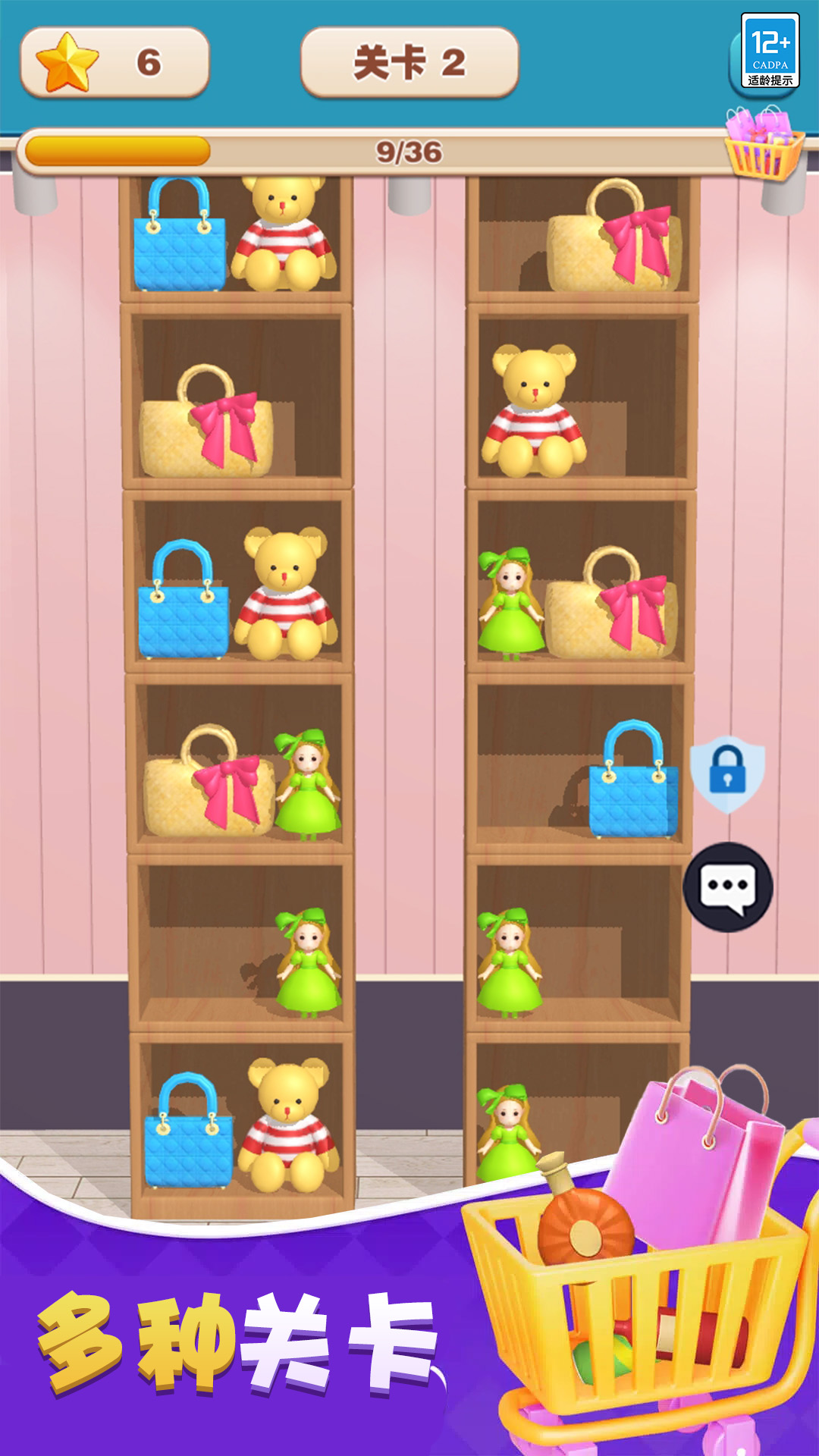 2、游戏设置了多个难度级别,从简单到困难,随时都能参与进来,移动物品进行轻松的消除挑战;